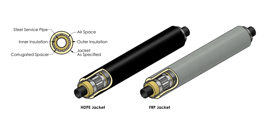 | Pipe Size | Insulation Thickness (Inches)* | Steel Conduit O.D. (Inches) | Outer Insulation (Inches)* | HDPE Jacket O.D. (Inches) | System Temperature |